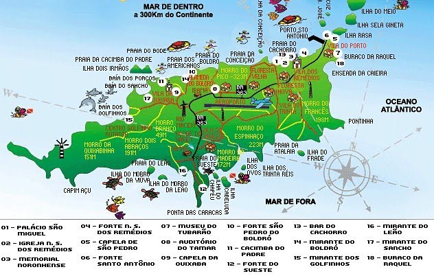 Plano descriptivo de las zonas más destacadas de Fernando de Noronha y sus diferentes actividades para hacer al aire libre.